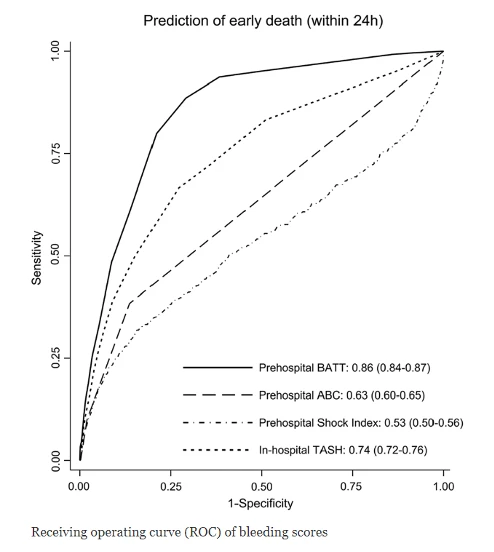 Dans cette même étude, l’approche en zone grise permet de différencier chacune des zones du score : la zone de rule-out (avec une sensibilité maximale) et la zone de rule-in (avec une spécificité maximale). La zone intermédiaire est dite zone grise (2). Pour chacune de ces zones, il convient de s’assurer que pour le paramètre à maximiser, l’autre paramètre ne soit pas trop faible. Par exemple, pour le triage des trauma sévère, l’American College of Surgeon fixe le seuil maximal d’undertriage (taux de faux négatif) à 5% et le seuil maximal d’overtriage (taux de faux positif) à 50%. L’undertriage (taux de faux négatif) correspond à 1-Se et l’overtriage (taux de faux positif) à 1-Sp. Dans le cas du BATT, pour un score à 3, on obtient une Se à 96% (soit 4% d’undertriage) avec une spécificité à 51% (soit 49% d’overtriage). Ce score permet de faire un rule-in sûr, sans provoquer un sur-triage trop important. Les autres scores présentés dans ce papier n’arrivent pas à accomplir ses performances, malgré des valeurs AUROC plus ou moins satisfaisantes.