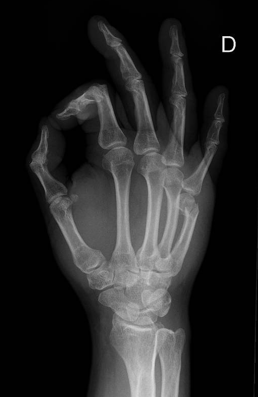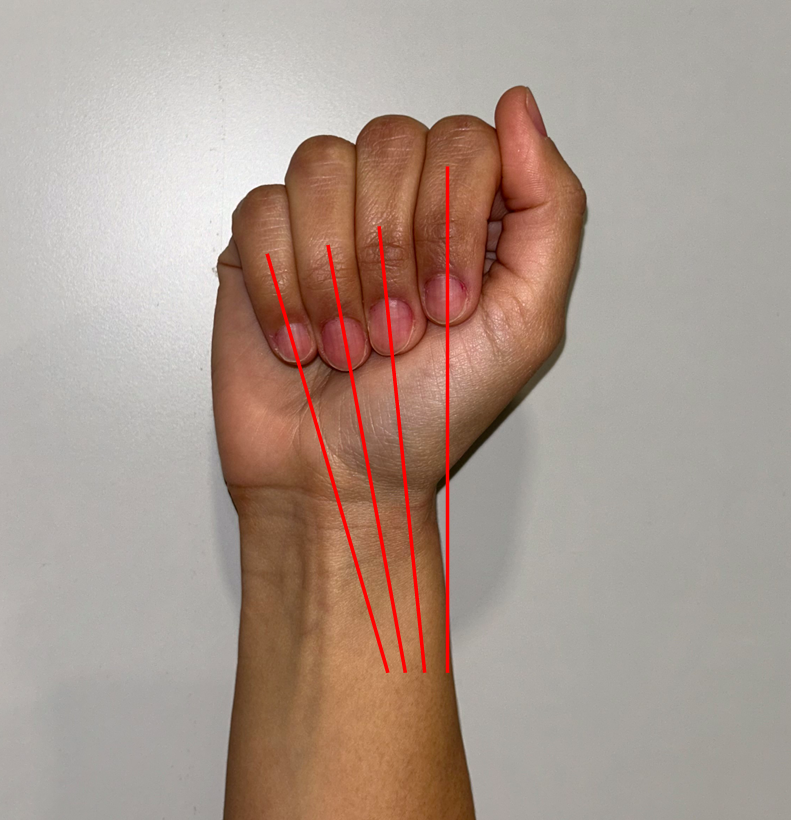 Image 3 : réalisée par M. KarakusPour les fractures du col du 5ème métacarpien, la bascule palmaire est acceptable jusqu’à 70°. Par contre pour le 4ème métacarpien la limite est fixée à 40° et il n’est accepté que 10° de bascule palmaire pour le 2ème et le 3ème métacarpien.