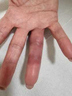 La patiente présente un hématome digital spontané paroxystique ou «syndrome d’Achenbach». Il s’agit d’une affection bénigne et rare caractérisée par l'apparition soudaine d'ecchymoses pouvant être douloureuses ou accompagnée de sensation de picotement ou brûlure sur un ou plusieurs doigts sans cause apparente ou après un traumatisme mineur.