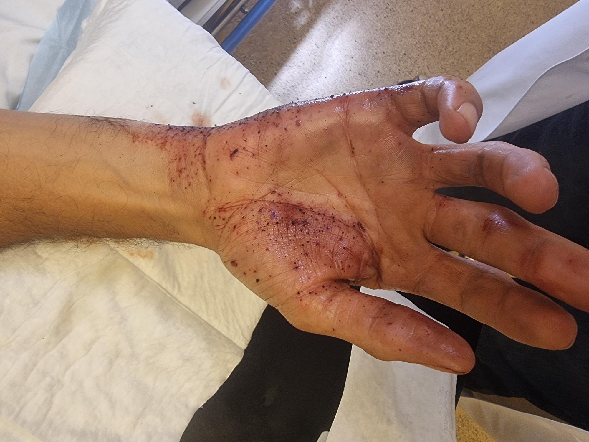 Ce patient présente des brûlures chimiques causée par l'exposition à des particules de ciment mouillé. Ce sont des brûlures caustiques liés au pH alcalin du mélange ciment-eau.La nature alcaline du ciment mouillé provoque une nécrose liquéfactive de la peau. Ces brûlures se développent insidieusement, avec une moyenne de 6 heures entre l'exposition et les signes visibles et continuent tant que le ciment est au contact de la peau. Les symptômes incluent une sensation de brûlure intense, un érythème, une douleur et éventuellement la formation de vésicules.