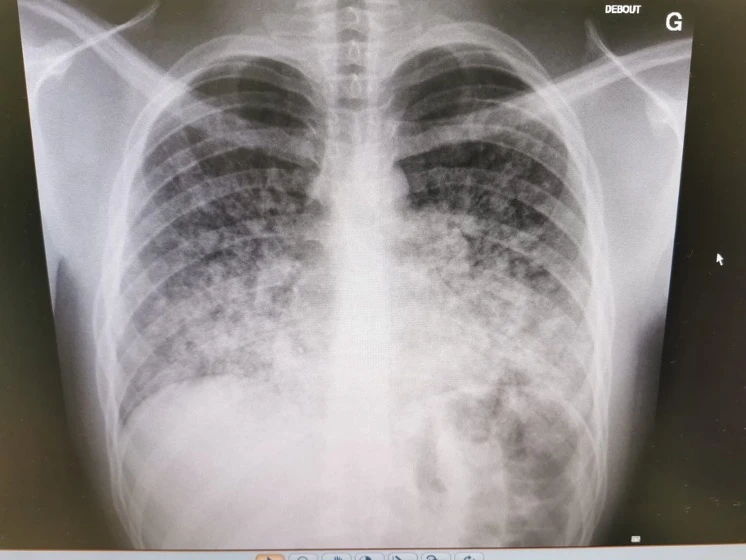 L’image ci-dessus est une radiographie debout, antéro-postérieure d’un jeune patient se présentant avec une dyspnée et une hémoptysie. La radiographie démontre un infiltrat alvéolaire diffus, prédominant aux deux bases, signant d’une hémorragie alvéolaire.