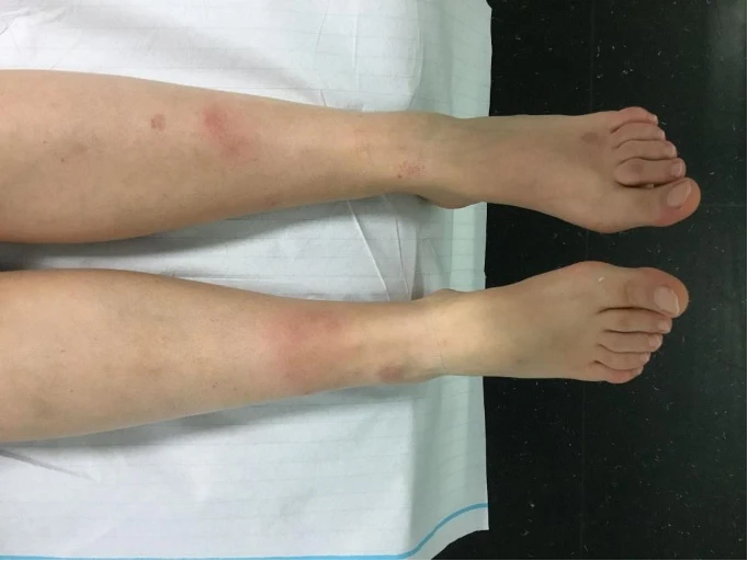 Une jeune patiente de 19 ans en bonne santé habituelle, originaire de Turquie mais actuellement installée en Suisse, consulte pour des lésions sur les membres inférieurs et sur la face dorsale des pieds, apparues il y a 3 semaines et persistante. Les lésions sont décrites comme douloureuses, en particulier au toucher, mais non prurigineuses. Il n’y a pas de notion de traumatisme, ni de symptômes généraux associés. Elle se plaint également d’une dyspnée de stade NYHA II depuis plusieurs mois. La patiente prend comme seule médication une contraception orale. L’examen clinique met en évidence des lésions centimétriques prétibiales bilatérales parfois confluentes, surélevées, érythémateuses et sensibles au toucher.