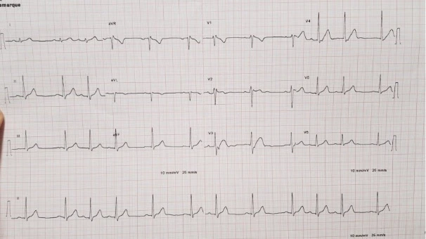 A l’examen clinique, constantes vitales : FC 70/min, TA 126⁄82 mmHg FR 12/min, SpO2 99% en air ambiant, afébrile. Examen cardio-pulmonaire et neurologique dans la norme.