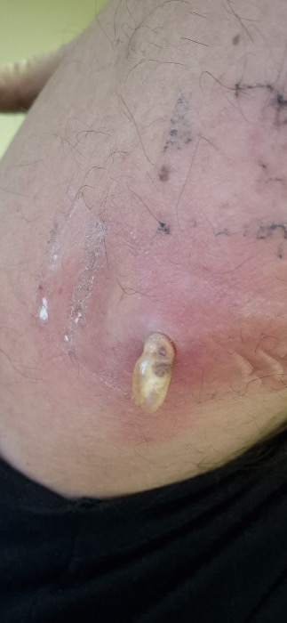 Deux semaines plus tard, il remarque une rougeur avec induration autours de la piqûre, avec de légère démangeaison et quelques épisodes de lancée douloureuse. Un écoulement séro-sanguinolant s'écoule par intermittence lorsqu'une pression est appliquée autours de la lésion. Il n'a pas de fièvre ni d’autres plaintes.
