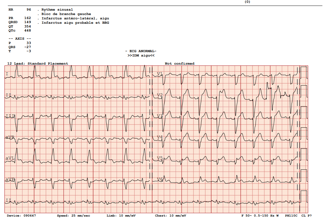L’ECG réalisé sur place montre un rythme sinusal avec un bloc de branche gauche (BBG) et des troubles de la repolarisation : sus-décalage dans le territoire septo-latéral et sous-décalage dans le territoire inférieur.