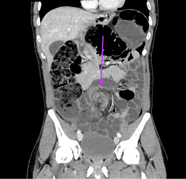 Ce scanner met en évidence un signe de Whirlpool (ou Whirl) qui représente la torsion du mésentère du sigmoïde et des vaisseaux mésentériques, diagnostic dans ce cas de volvulus du sigmoïde. On constate une dilatation en amont de l'ensemble du cadre colique et de quelques anses iléales avec stase colique importante, sans signes de souffrance intestinale.