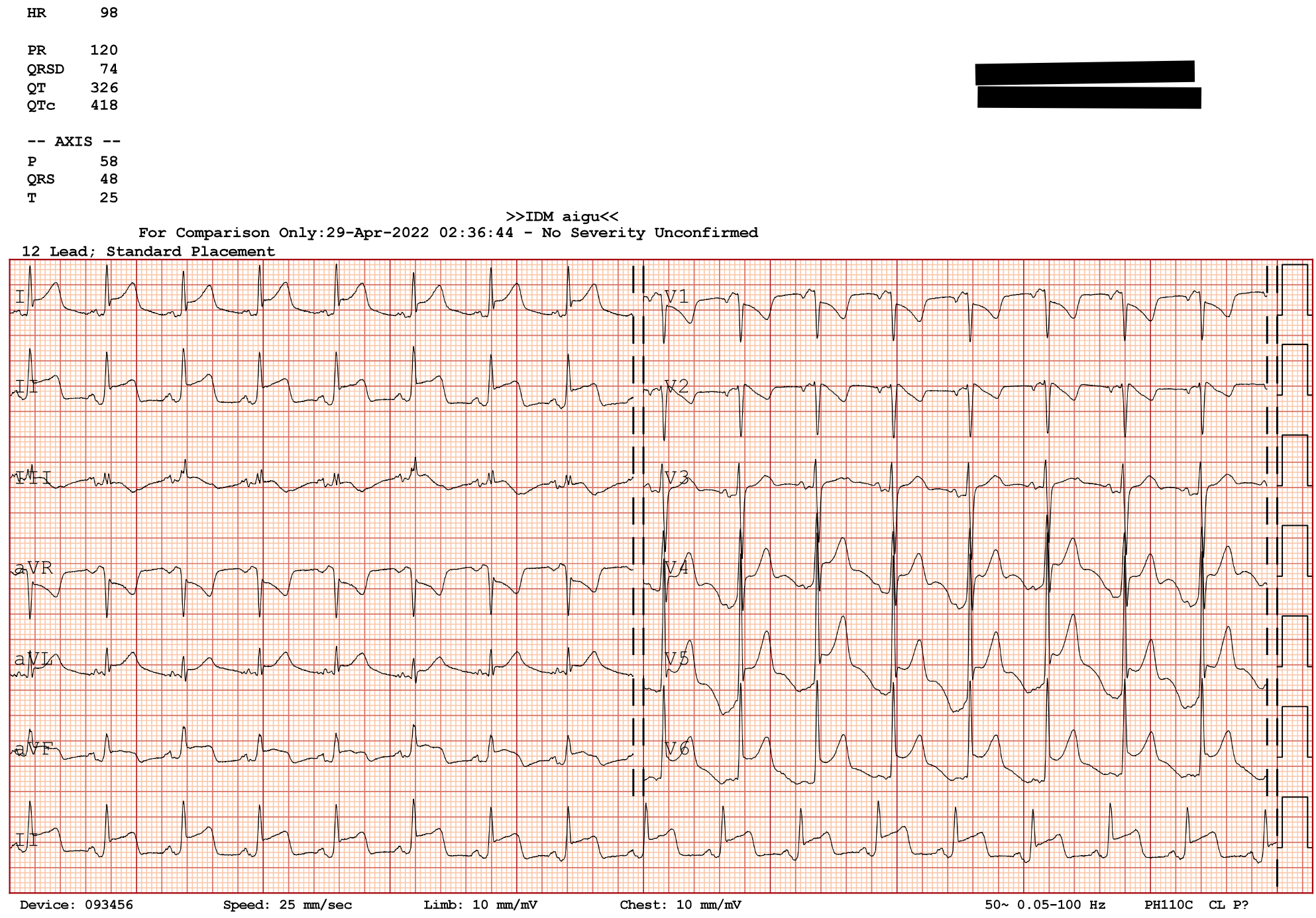 L’ECG montre des sus-décalages diffus accompagnés d’images en miroir dans les dérivations à polarité négative (aVR, V1). On observe également, notamment dans les dérivations inférieures, un sous-décalage du segment PR et, dans les dérivations latérales, un aspect descendant du segment TP.
