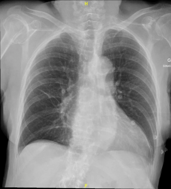 Madame X est une patiente de 89 ans, connue pour une démence, qui se présente aux urgences avec une baisse de l’état général depuis une semaine. Elle décrit une dyspnée d’effort et une légère toux. Le reste de l’anamnèse par système est non contributive, elle ne rapporte notamment pas de chute récente. L’examen clinique n’est pas relevant hormis une désaturation à 91% à l’air ambiant. Le bilan biologique révèle un syndrome inflammatoire, une absence de cinétique des troponines, des D‑dimères dans la norme pour l’âge et un NT-pro-BNP dans la norme. L’ECG ne montre pas de modifications. La radiographie (Rx) du thorax ne révèle pas de signe de surcharge ni d’infiltrat mais elle révèle autre chose :