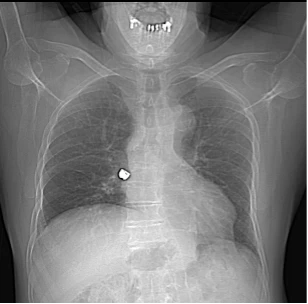Le CT-scan thoracique, dont on voit ici le scout, met en évidence une structure hyperdense, de densité métallique, au sein de la bronche intermédiaire droite, pouvant correspondre à une couronne dentaire métallique, sans signe d’occlusion complète de la bronche. L’évolution est favorable après récupération de la dent logée dans la bronche intermédiaire droite par bronchoscopie.