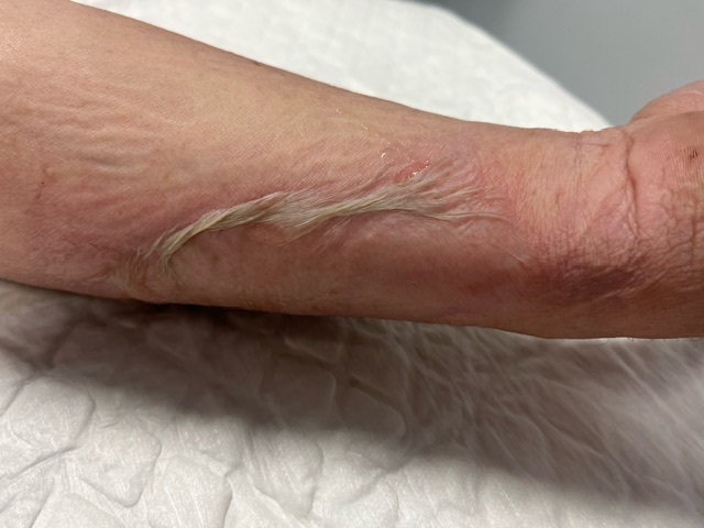 Un patient consulte les urgences pour des brûlures de l’avant-bras suite à un retour de flamme provoqué par l’embrasement d’un récipient d’essence qui s’est renversé, alors qu’il travaillait.