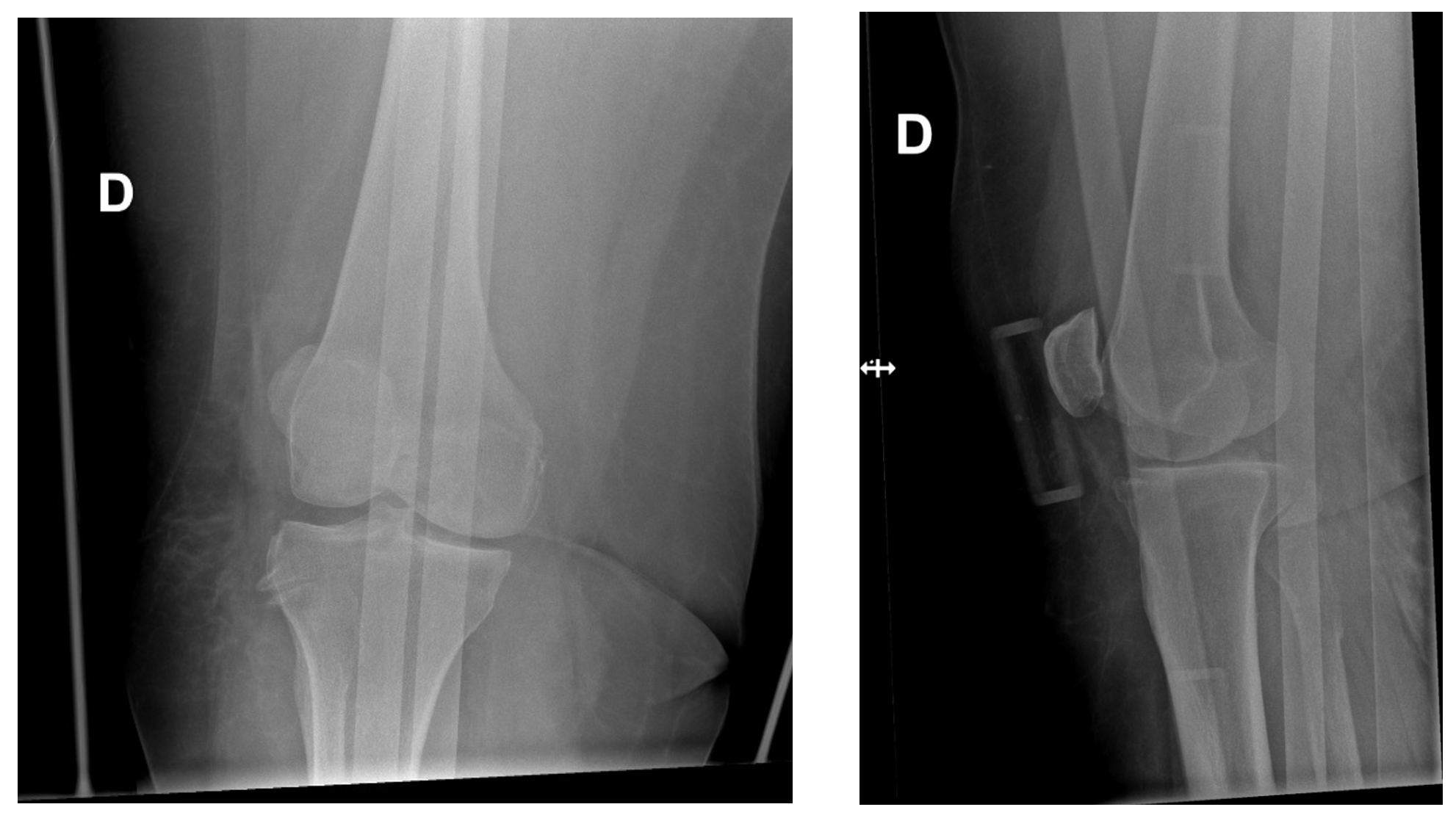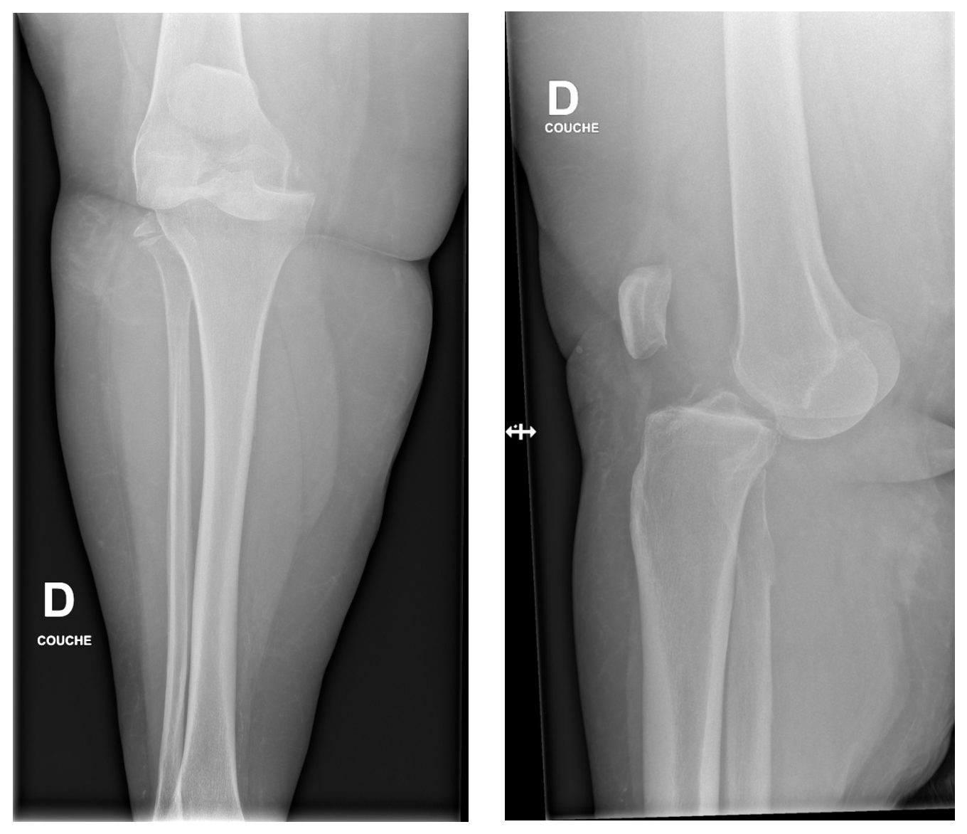 Les radiographies montrent une luxation antérieure du genou avant et après réduction.