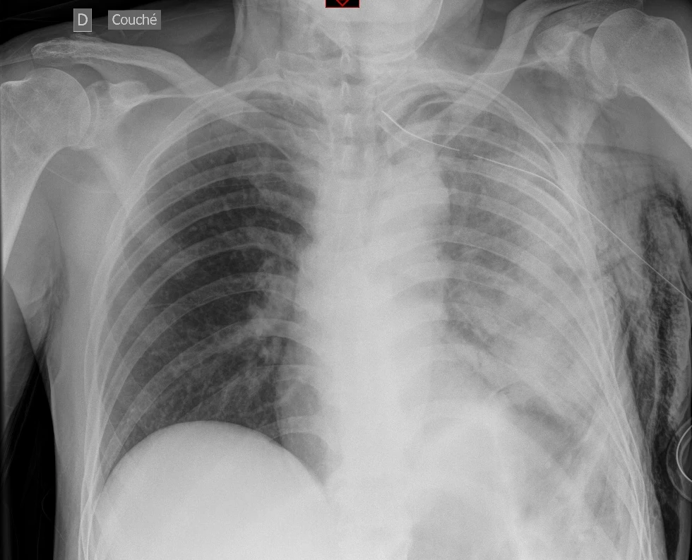 Peu de temps après avoir mis en place un drain thoracique à un jeune patient de 32 ans souffrant d’un premier épisode de pneumothorax spontané primaire, tu constates qu’il développe une tachypnée avec une désaturation à 85% à l’air ambiant et une douleur respiro-dépendante.