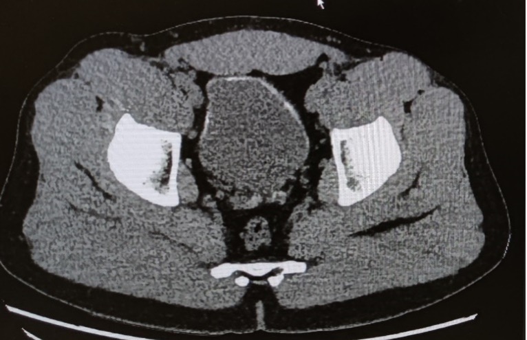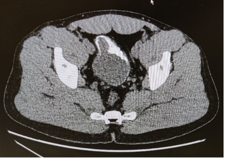 Tu regardes les images immédiatement avec la chirurgienne, qui te confirme la présence d’un diverticule enflammé correspondant à une diverticulite Hinchey Ia. Dans l’attente des suites à donner à ce diagnostic de diverticulite, tu vois également cette image au niveau de la vessie :
