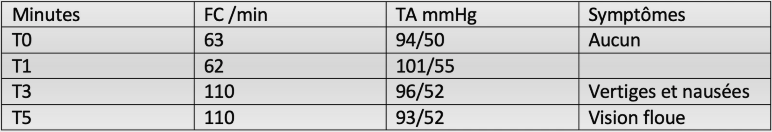 L’examen clinique et l’ECG sont normaux. Un test de Schellong est réalisé :