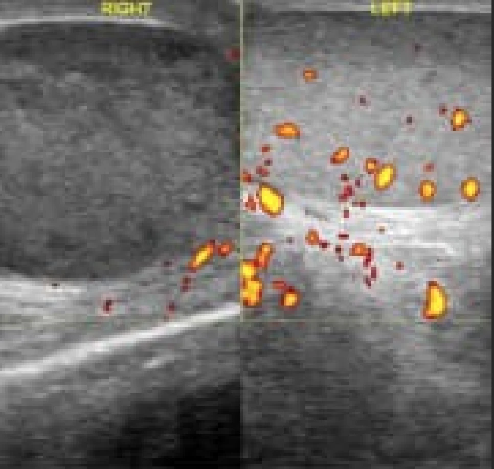 Un patient de 19 ans se présente aux urgences, un samedi soir 4 heures après l’apparition d’une douleur brutale au niveau du testicule. Vous effectuez cette échographie scrotale en attendant l’arrivée de l’urologue :