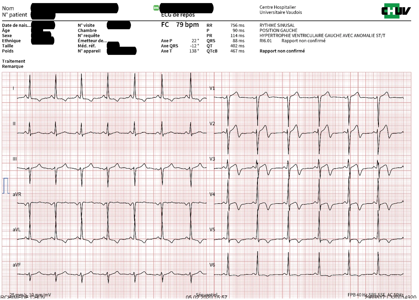 Un homme de 58 ans, sans antécédent relevant hormis une hypertension artérielle bien contrôlée sous monothérapie, se présente aux urgences en raison d’une douleur thoracique oppressive non irradiante. Cette douleur est apparue en montant des escaliers 4 heures auparavant et a persisté durant 2 heures. Actuellement, le patient ne présente plus de douleur. Le patient a des paramètres vitaux dans la norme. Une fois installé dans un box, un ECG est réalisé :