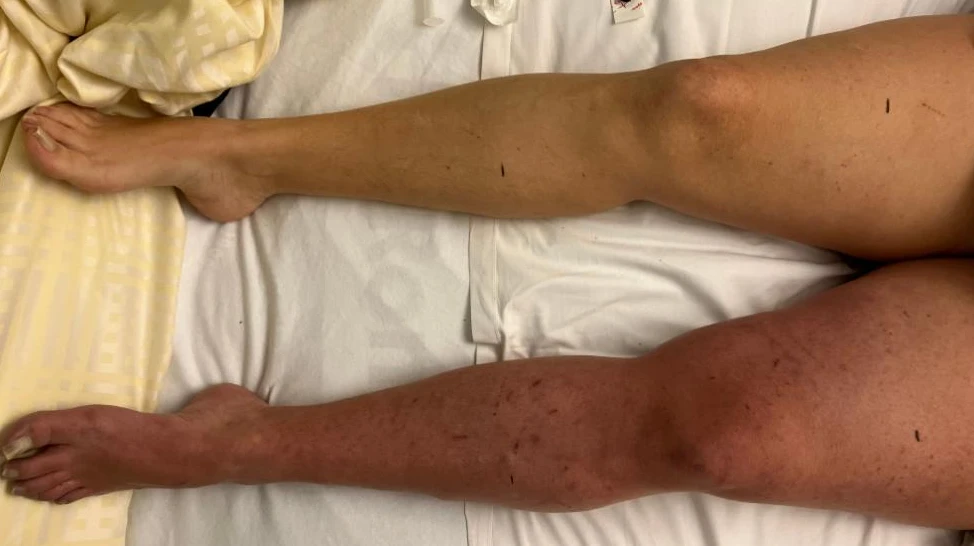 Une patiente de 44 ans, connue pour une hypertension artérielle, un SAOS appareillé, un tabagisme actif et une obésité (BMI 30 kg/​m2), se présente aux urgences pour une importante douleur du membre inférieur gauche d’apparition soudaine le jour même et associée à un œdème s’aggravant rapidement. La veille, elle a consulté une permanence médicale en raison d’une douleur thoracique associée à une dyspnée et une toux. Elle a été mise sous traitement antibiotique pour une suspicion de pneumonie. Outre, les antibiotiques, elle prend comme traitement une pilule oestro-progestative. A l’examen clinique, la patiente est hémodynamiquement stable et afébrile. Localement, les membres inférieurs sont comme sur l’image, avec un pouls pédieux bien palpé et une hypoesthésie sans déficit moteur.