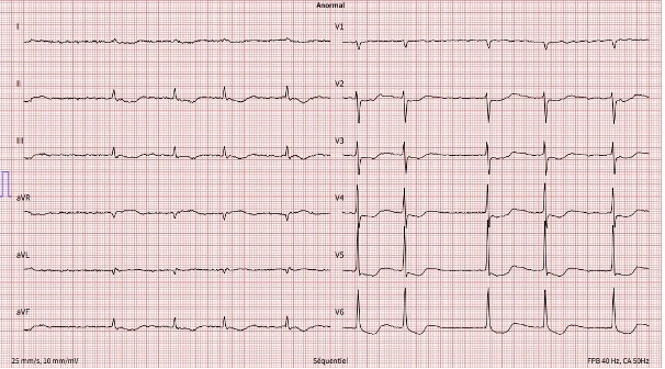 Une patiente de 73 ans se présente aux urgences en raison d’une asthénie associée à une oppression thoracique et des nausées depuis quelques heures. Elle est connue pour une fibrillation auriculaire (FA) traitée par métoprolol 200 mg/jour, digoxine 0.125 mg/jour et apixaban 5 mg 2x/jour. Elle est bradycarde entre 30 et 70 bpm, hypotendue à 90/45 mmHg, sature à 94% à air ambiant et afébrile.
